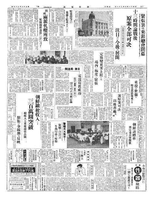 - 緊張裏(긴장리)에東銀總會閉幕(동은총회폐막) 十三時間論戰後(십삼시간론전후) 原案全部可决(원안전부가결)