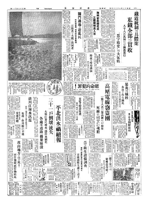 - 平北洪水禍續報(평배홍수화속보) 三十一戶倒壞(삼십일호도괴)、流失(류실)