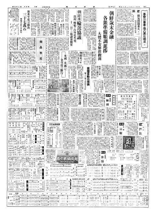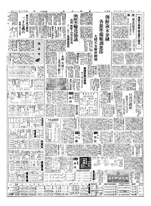 - 朝鮮歲末金融(조선세말김융)=各銀凖備順調進捗(각은준비순조진보) 大體不安解消觀測(대체부안해소관측)
