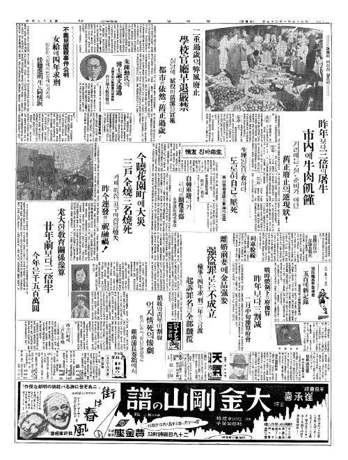 - 昨年(작년)보다 三倍(삼배)의屠牛(도우) 市內(시내)에牛肉飢饉(우육기근)