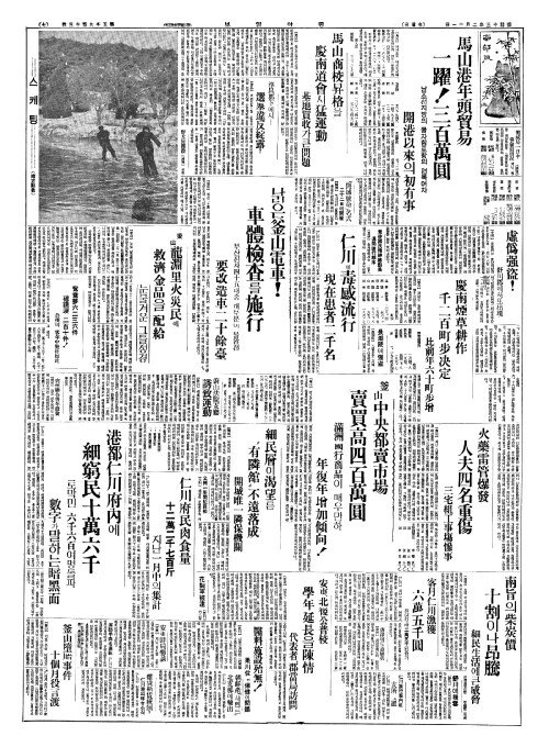 - 馬山港年頭貿易(마산항년두무역) 一躍(일약)!三百萬圓(삼백만원)