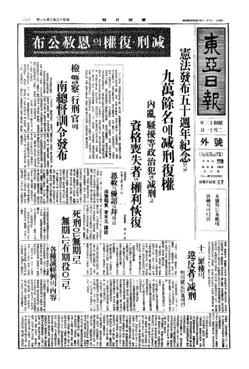 - 今日(금일)의恩赦實施(은사실시)에 减刑復權(감형복권)이二萬名(이만명)