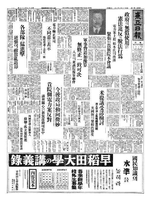 - 今後政局動向微妙(금후정국동향미묘) 貴院側電力案反對(귀원측전력안반대)