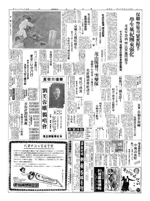 - 保聯(보련)、警察(경찰)과緊密握手(긴밀악수) 學生風紀團束强化(학생풍기단속강화) 未成年禁酒(미성년금주)、煙法實施問題等(연법실시문제등) 今月廿日頃(금월입일경)、保導主任聯合會議(보도주임련합회의)를開催(개최)