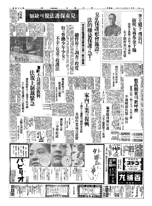 - 李王殿下(리왕전하)께옵서 淑明女專基金下賜(숙명여전기김하사) 時價廿萬圓(시가입만원)의山林下賜(산임하사)를吩咐(분부) 女子敎育界(여자교육계)의光榮(광영)