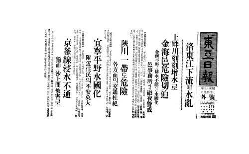 - 梁山地方豪雨暴注(량산지방호우폭주) 上溪平野泥海化(상계평야니해화)