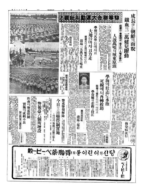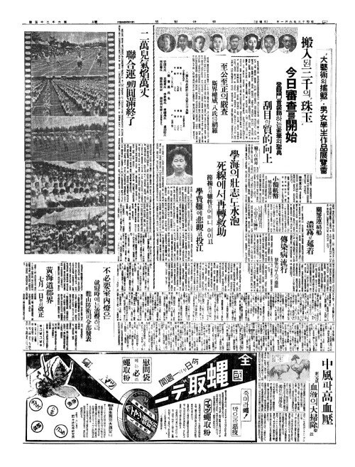 - "大藝術(대예술)의搖籃(요람)"·男女學生作品展覽會(남녀학생작품전남회) 搬入(반입)된三千(삼천)의"珠玉(주옥)"今日審查(금일심사)를開始(개시) 登龍門(등룡문)을裝飾(장식)하는豪華(호화)의聖典(성전) 刮目(괄목)할質的向上(질적향상)