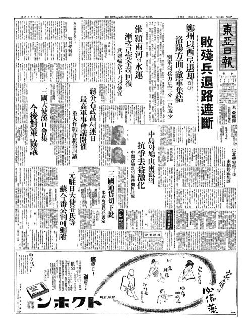 - 鄭州陷落(정주함낙)은 數日中(삭일중) 支那軍當局吿白(지나군당국고백)