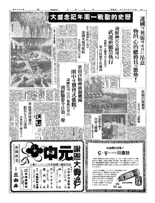 - 默禱(묵도)、參拜(삼배)、慰靈祭(위령제)로 銃後赤誠(총후적성)의益固盟誓(익고맹서) 敬虔嚴肅(경건엄숙)한記念行事(기념행사)