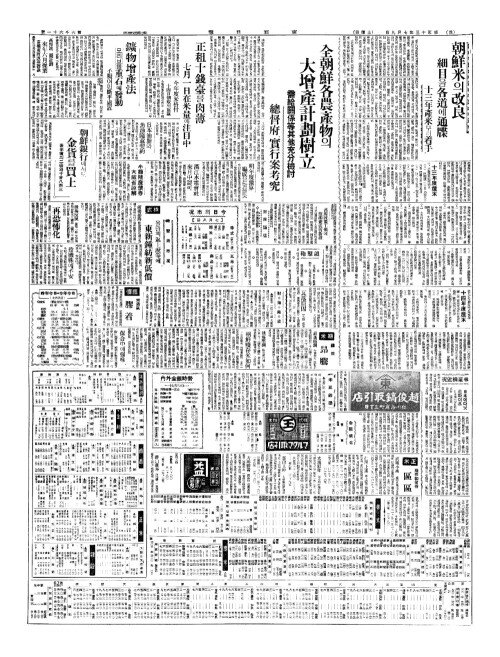 - 全朝鮮各農產物(전조선각농산물)의 大增產計劃樹立(대증산계획수입)