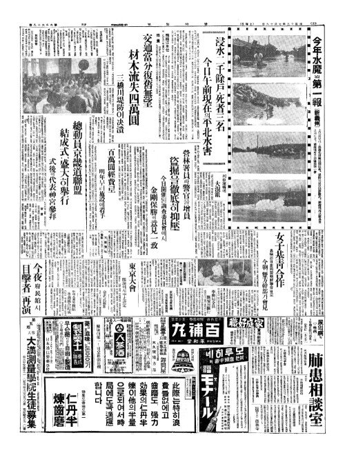 - 浸水二千餘戶(침수이천여호)·死者三名(사자삼명) 今日午前現在(금일오전현재)의平北水害(평북수해)