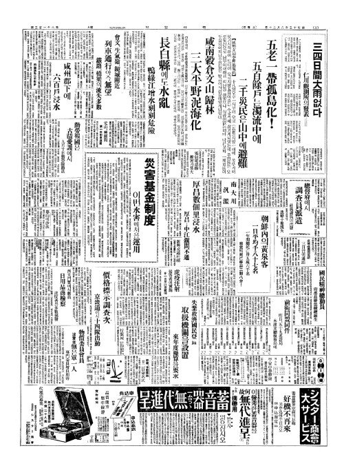 - 大同江上流地方(대동강상류지방)에沙汰(사태) 人畜(인축)、家屋被害多數(가옥피해다삭) 交通杜絕(교통두절)로詳細未判(상세미판)