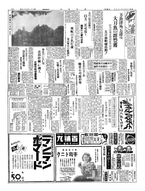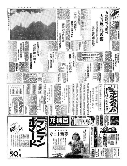 - 方魚津外五港(방어진외오항)에 大刀魚(대도어)[칼치]群豐獲(군풍획) 밤과낮에장관이룬각어항 五百漁船總出動(오백어선총출동)!