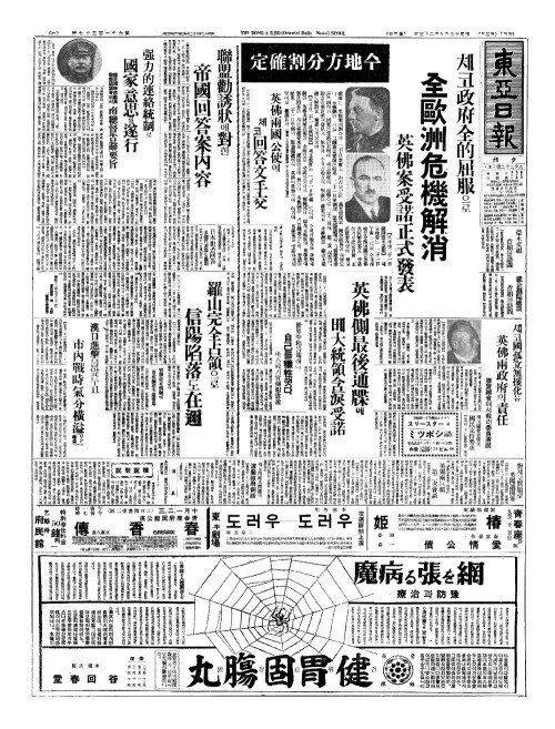 - 수地方分割確定(지방분할확정) 체코政府全的屈服(정부전적굴복)으로 全歐洲危機解消(전구주위기해소) 英佛案受諾正式發表(영불안수낙정식발표)