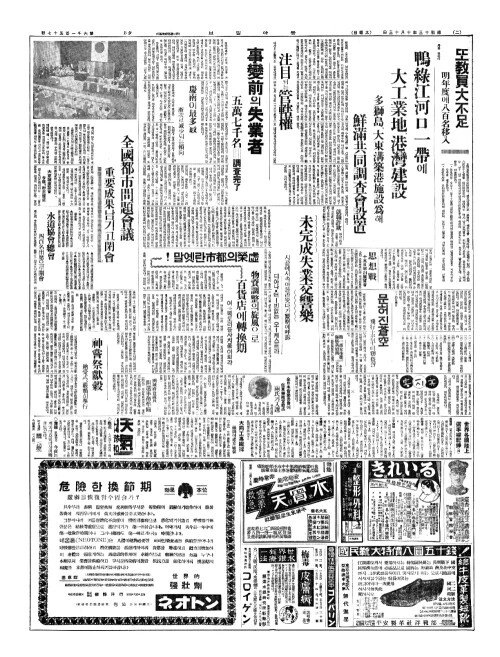 - 鴨綠江河口一帶(압녹강하구일대)에 大工業地(대공업지)、港灣建設(항만건설) 多獅島(다사도)、大東溝築港施設爲(대동구축항시설위)해 鮮滿共同調查會設置(선만공동조사회설치)