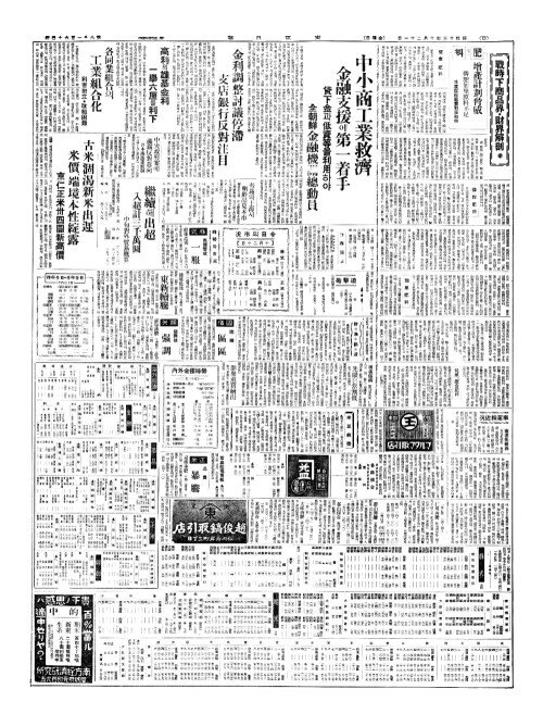 - 中小商工業救濟(중소상공업구제) 金融支援(김융지원)에第一着手(제일저수) 貸下金(대하김)과低資等(저자등)을利用(리용)하야 全朝鮮金融機關總動員(전조선김융기관총동원)