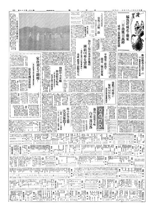 - 鰛魚群咸北(온어군함북)에襲來(습내) 二日漁獲百萬樽(이일어획백만준) 咸南(함남)은依然絶影狀態(의연절영장태)