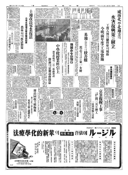 - 咸南北(함남북)、平北地方(평배지방)의 水害復興策(수해복흥책)을樹立(수입)