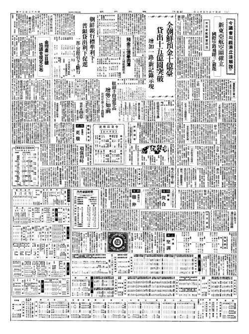 - 全朝鮮預金十億臺(전조선예김십억대) 貸出十五億圓突破(대출십오억원돌파)
