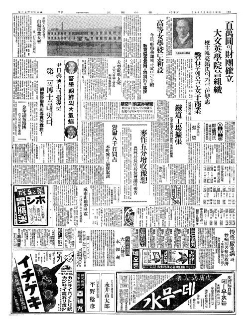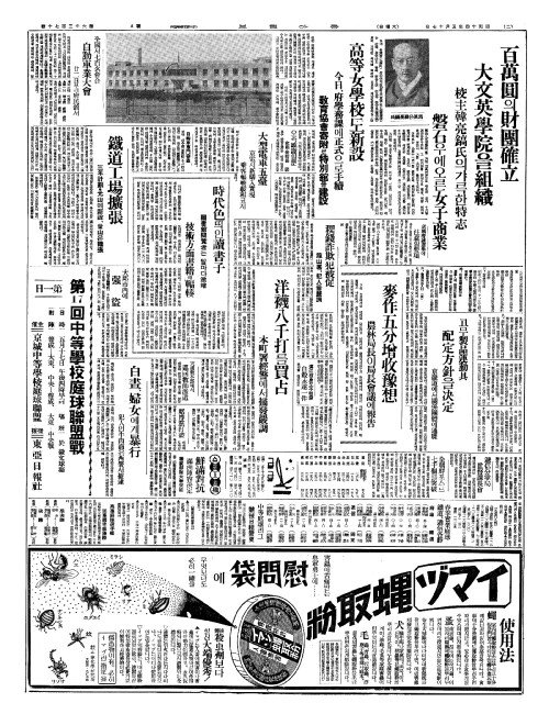 - 百萬圓(백만원)의財團確立(재단확입) 大文英學院(대문영학원)을組織(조직)