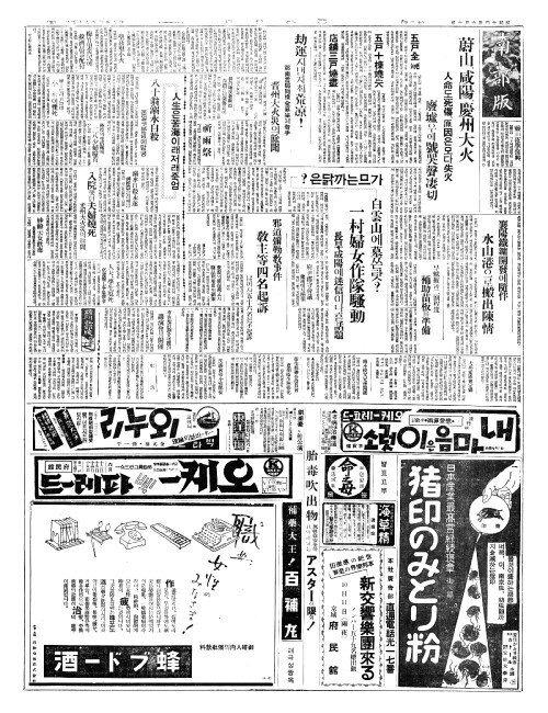 - 楊江面佳谷里(양강면가곡리)에大火(대화) 六十餘戶全燒(륙십여호전소)