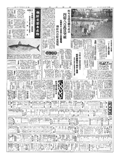 - 昨年度蔬菜總生產高(작년탁소채총생산고) 四億八百萬貫突破(사억팔백만관돌파)