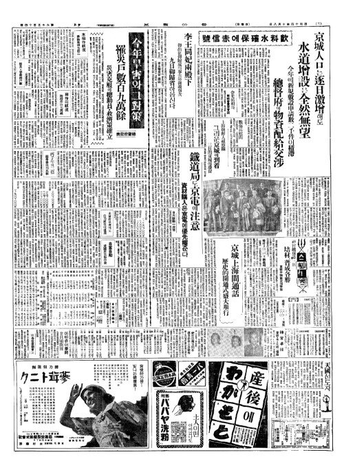 - 京城人口(경성인구)는逐日激增(축일격증)해도 水道增設(수도증설)은全然無望(전연무망)