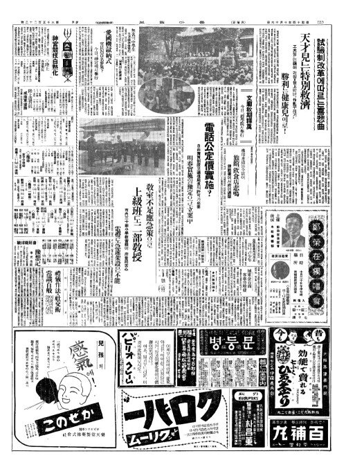 - 敎室不足應急策(교실부족응급책)으로 上級班(상급반)도二部敎授(이부교수)