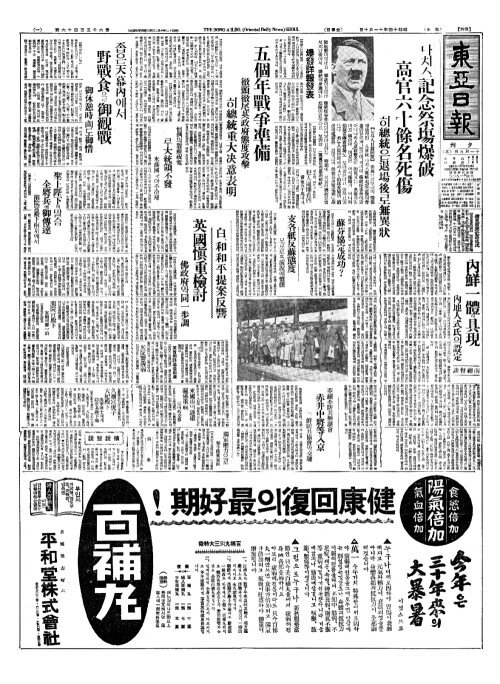 - 나치스記念祭塲爆破(기념제장폭파) 高官六十餘名死傷(고관륙십여명사상) 히總統(총통)은退場後(퇴장후)로無異狀(무이상)