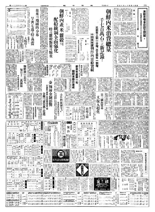 - 朝鮮內產(조선내산)、米(미)、雜糓(잡곡)의 配給統制全面强化(배급통제전면강화)