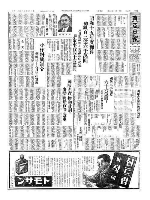 - 昭和十五年度豫算(소화십오년도예산) 總額百三億六千萬圓(총액백삼억륙천만원) 八日閣議(팔일각의)에서異議(이의)없이决定(결정) 臨時軍事費四十四億圓(임시군사비사십사억원)