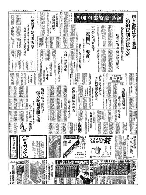 - 海運(해운)·造船業(조선업)에 에폭 四大海運法令(사대해운법영)을通過(통과) 船舶統制(선박통제)·運賃公定(운임공정)
