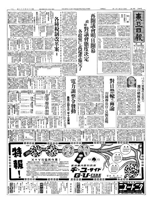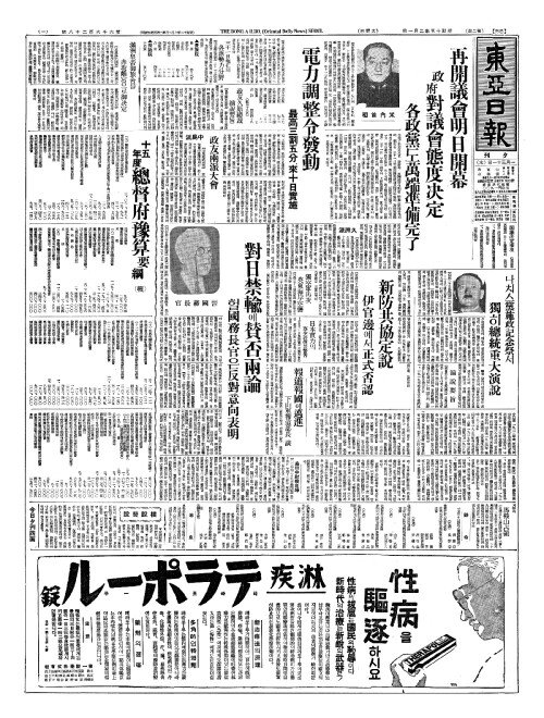 - 再開議會明日開幕(재개의회명일개막) 政府對議會態度决定(정부대의회태도결정) 各政黨(각정당)도萬端凖備完了(만단준비완요)