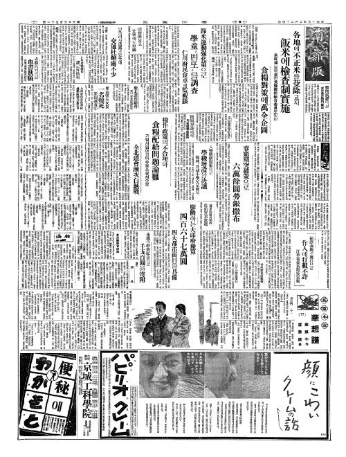 - 各地(각지)에不正米(부정미)를芟除(삼제)코저 飯米(반미)에檢查制實施(검사제실시)