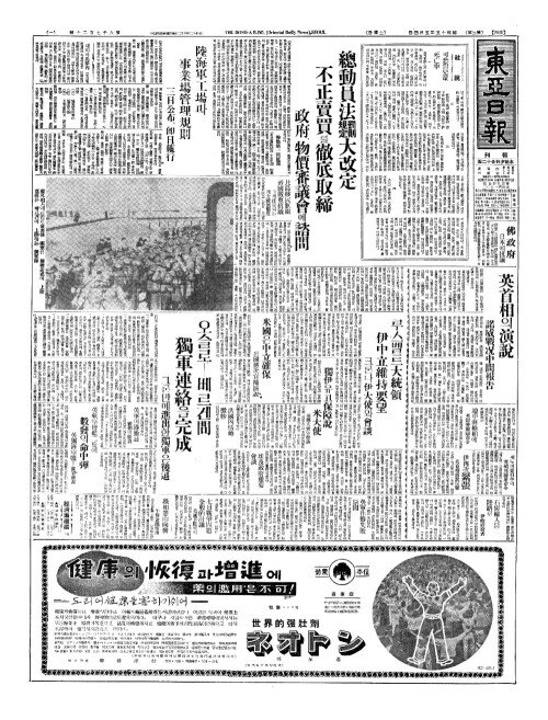 - 英首相演說(영수상연설) 二日下院(이일하원)서戰况報吿(전황보고)