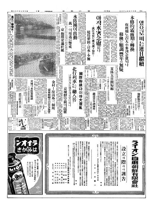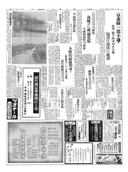 - 水魔(수마)로不通(부통)한各線(각선) 七月一日(칠월일일)부터開通(개통)