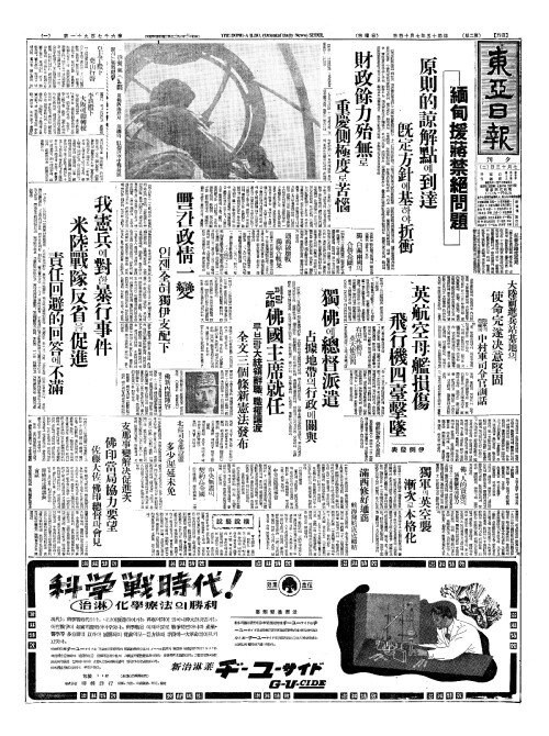 - 英航空母艦損傷(영항공모함손상) 飛行機四臺擊墜(비행기사대격추) 伊側發表(이측발표)
