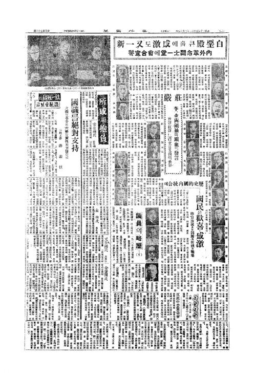 白堊殿(백악전)큰홀에感激(감격)도又一新(우일신) 內外革命鬪士一堂(내외혁명투사일당)에會合宣誓(회합선서) 議員(의원)의略歷(략역) (1)