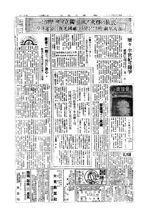 民族(민족)의烽火(봉화)! 피로"獨立(독립)의씨"뿌린날 廿八年前(입팔년전)"이날은왓다"祖國光復(조국광복)을完遂(완수)하자
