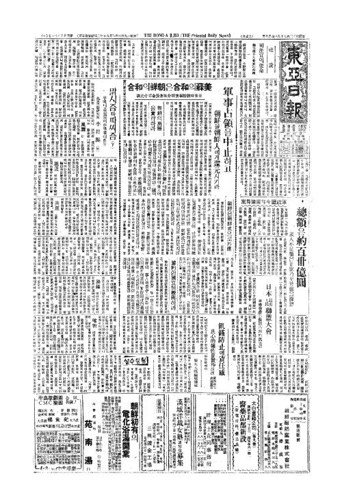 - 軍政廳今年度豫算案(군정청금년탁예산안) 總額(총액)은約百卅億圓(약백삽억원) 歲入不足額(세입부족액)은廿億乃至卅億(입억내지삽억)을豫想(예상)