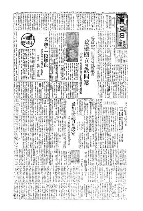 - 參加協議(삼가협의)키로決定(결정) 民主議院正式態度發表(민주의원정식태도발표)
