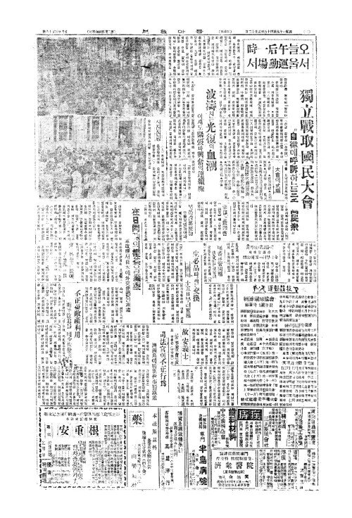 - 오늘午后一時(오후일시) 서울運動場(운동장)서 獨立戰取國民大會(독입전취국민대회)