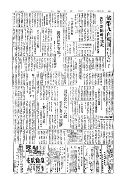 - 僞幣九百萬圓(위폐구백만원)어디갓나? 먼저新聞社(신문사)에飛火(비화) ○○、解放(해방)、經理部長取調(경리부장취조)
