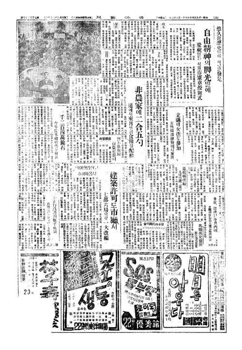 - 悠久(유구)한歷史(역사)우에 새로운發足(발족) 自由精神(자유정신)의脚光(각광)밑에 慶祝(경축)받는 서울市憲章授與式(시헌장수여식)