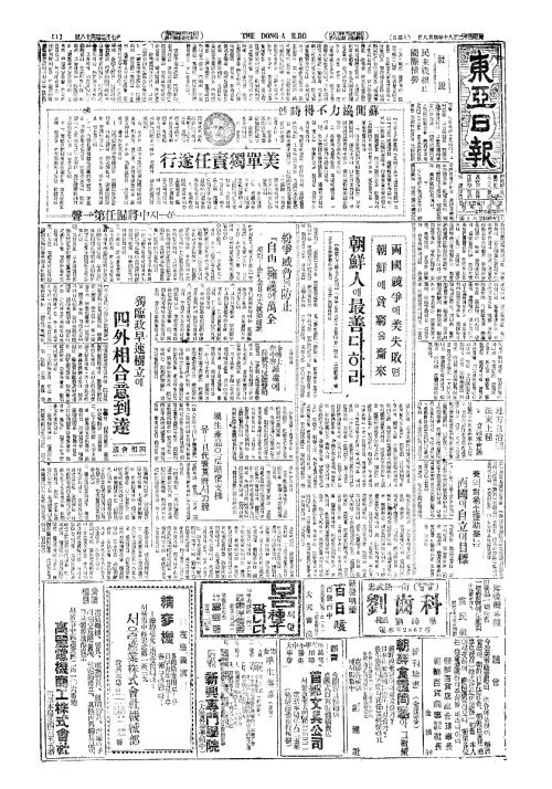 - 獨臨政早速樹立(독림정조속수입)에 四外相合意到達(사외상합의도달) 四相會議(사상회의)
