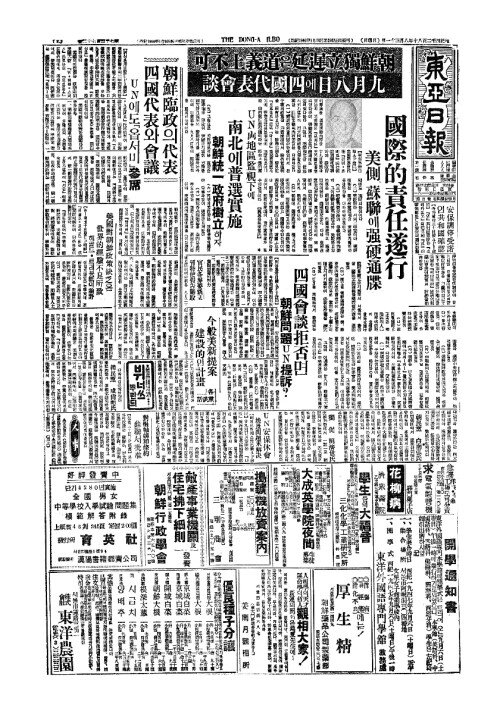 - 朝鮮獨立遲延(조선독립지연)은道義上不可(도의상부가) 九月八日(구월팔일)에四國代表會談(사국대표회담)