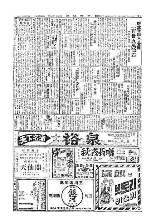 - 解放後輸入(해방후수입)된食糧(식양) 二百卅五萬餘石(이백삽오만여석)