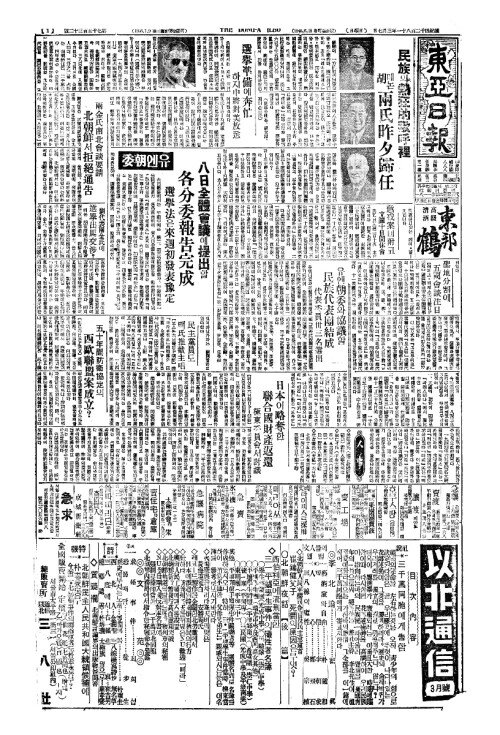 - 民族(민족)의熱狂的歡呼裡(열광적환호리) 메논胡兩氏昨夕歸任(호양씨작석귀임)