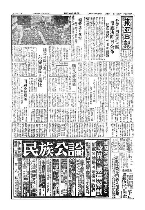 - 『外勢(외세)의阿附者(아부자)』에斷(단) 反族法昨日公布(반족법작일공포) 迂餘曲折(우여곡절)마침내發效(발효)