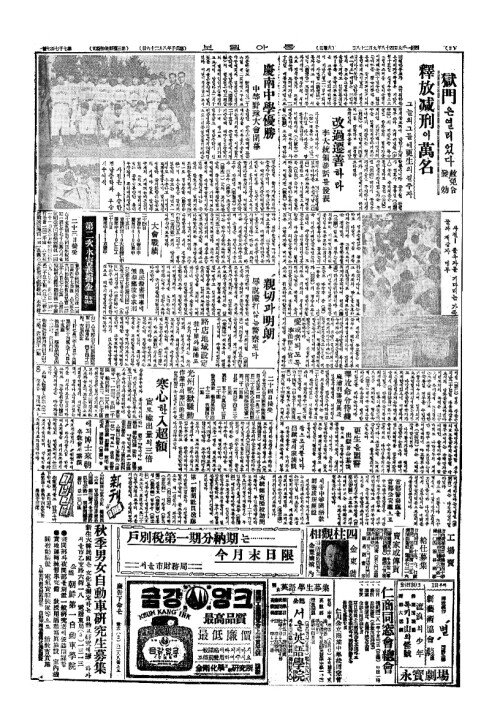 - 本報紙面擴充刷新(본보지면확충쇄신) 十月一日(십월일일)부터 倍大頁發行(배대혈발행)